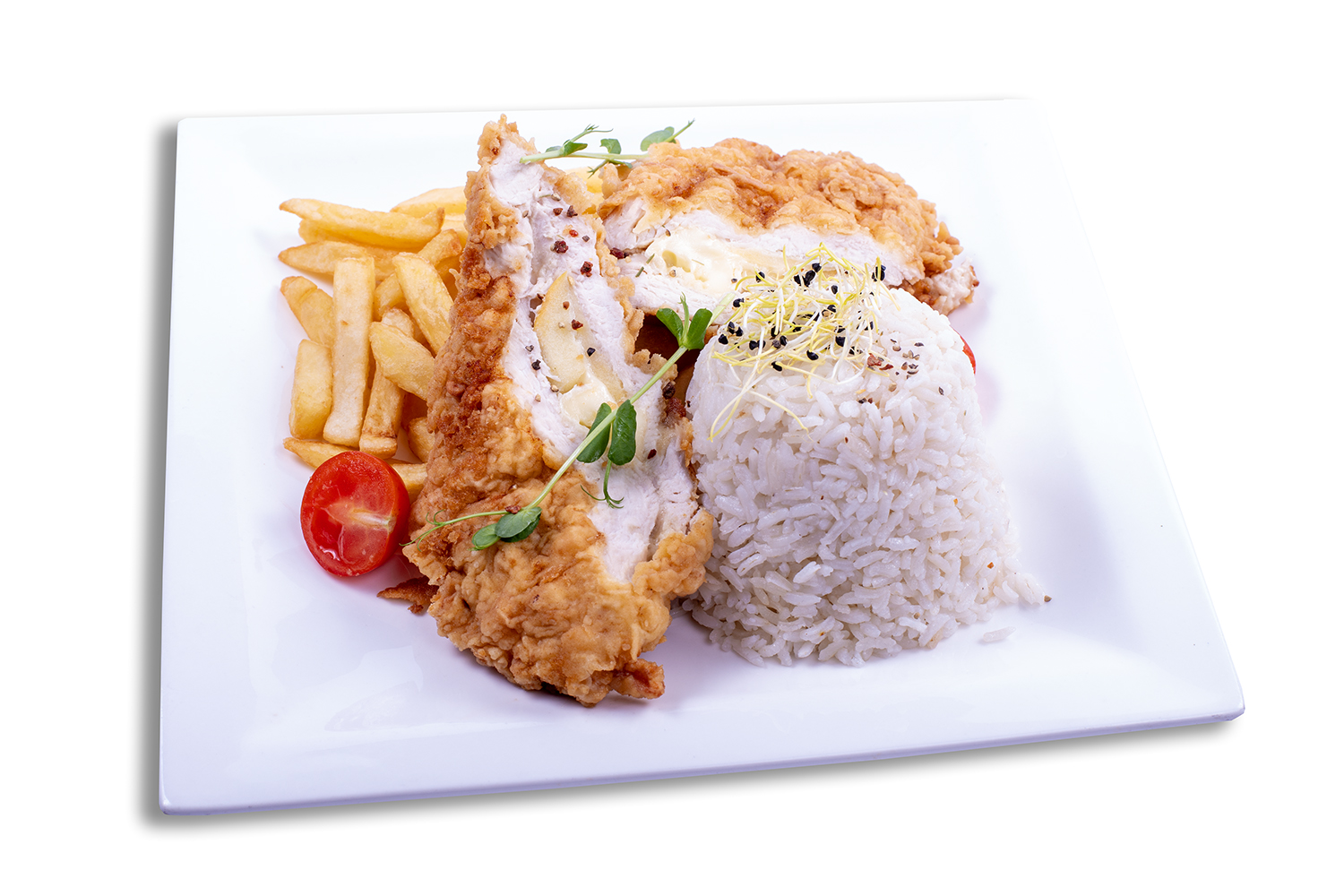 Rántott sajt tál, rizs, tartár